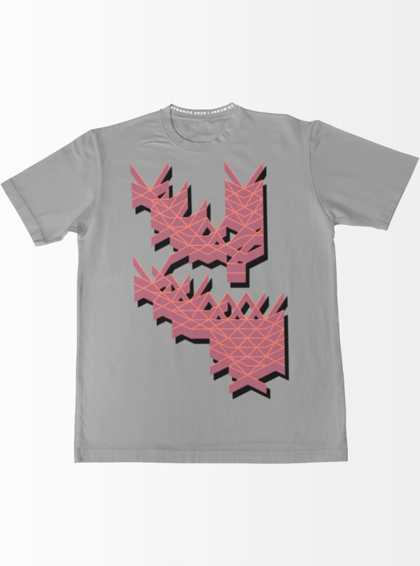Návrh uměleckého díla na tričko vychází z obrazového systému, který́ jsem navrhl a rozpracovávám jej v několika variacích. Systém vychází z vodorovných a diagonálních čar, které tvoří síť v ploše. Tu jsem deformoval a jedinou tuto promáčknutou část zachoval pro vizuální část díla, se kterou dál pracuji – přidal jsem jí hloubku a stín.